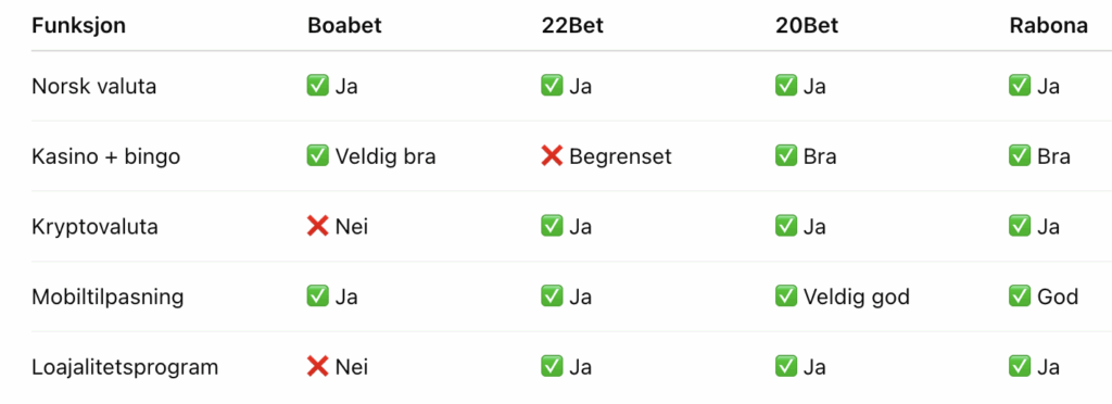 Boabet utmerker seg særlig med sitt kasino- og bingotilbud – unikt i denne sammenligningen.